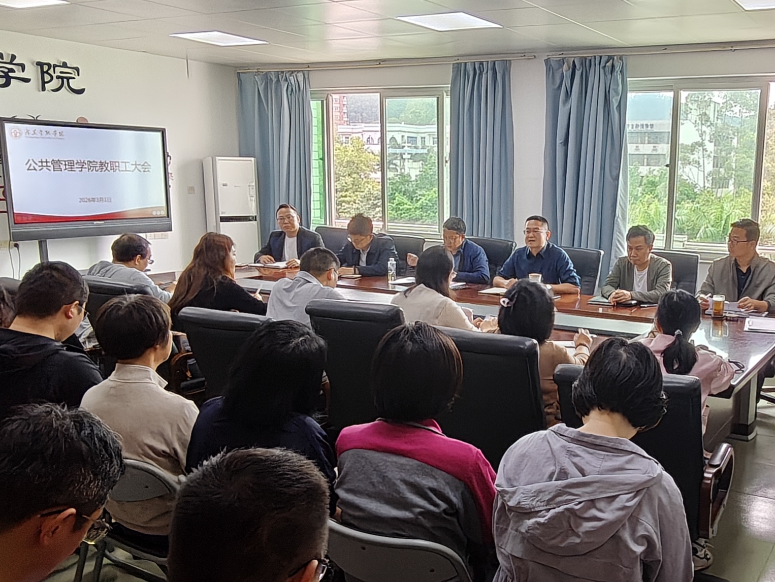 2026年3月1日,公共管理学院召开新学期第一次教职工大会。院党委副书记、院长何亦名,党委副书记吴喜涛,副院长于大川、黄永弟,院长助理张镒以及学院全体教职工参加了会议。会议由院党委书记何晓华主持。